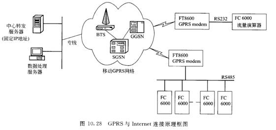 (2)工作原理 GPRS是在原有的基于電路交換(CSD)方式的GSM網(wǎng)絡(luò )上引人兩個(gè)新的網(wǎng)絡(luò )節點(diǎn): GPRS服務(wù)支持節點(diǎn)(SGSN)和網(wǎng)關(guān)支持節點(diǎn)(GGSN)。SGSN和MSC在同一等級水平,并跟蹤單個(gè)MS的存儲單元實(shí)現安全功能和接入控制,且通過(guò)幀中繼連接到基站系統。GGSN支持與外部分組交換網(wǎng)的互通,并經(jīng)由基于IP的GPRS骨干網(wǎng)和SG-SN連通。國10.28給出了GPRS與Internet連接原理框圖。